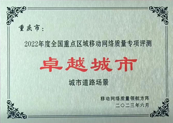 2023年6月5日,第二届“移动网络高质量发展论坛”暨2022年度全国重点场所移动网络质量评测、大众众测和运营商普测情况发布会在北京举行。工业和信息化部组织中国信通院对全国62个城市的主要道路、地铁、公园、医院、景点、车站等重点场所进行实地测评,并发动基础电信企业、个人用户广泛参与,对全国主要城市移动通信质量进行了综合、全面的评估。重庆城市道路5G驻留时长占比100%,网络覆盖率达99.61%,优质通话占比92.01%,5G下行速率923.26Mbps,再次获得全国移动网络质量城市道路场景类卓越城市奖。
