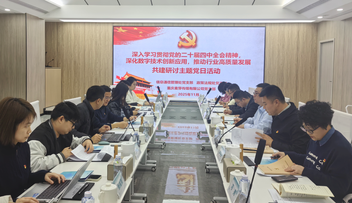 为推动学习贯彻党的二十届四中全会精神走深走实,落实常态化“三服务”工作要求,推动机关党建和业务工作深度融合,近日,我局信息通信管理处党支部、政策法规处党支部与重庆麦芽传媒有限公司党支部,围绕“深入学习贯彻党的二十届四中全会精神,深化数字技术创新应用,推动行业高质量发展”为主题,开展了联合党建活动。